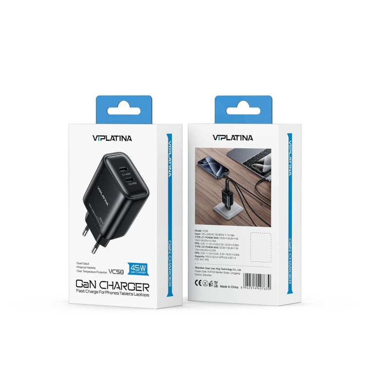 آداپتور VIPLATINA VC58 یک شارژر دیواری پیشرفته با توان ۴۵ وات واقعی است که با بهرهگیری از تکنولوژی GaN (نیترید گالیوم)، عملکردی سریعتر، خنکتر و کارآمدتر نسبت به شارژرهای معمولی ارائه میدهد. فناوری GaN باعث میشود این آداپتور با وجود توان بالا، در ابعادی کوچک و وزن سبک طراحی شود؛ بدون داغ شدن و با راندمان بسیار بالا.